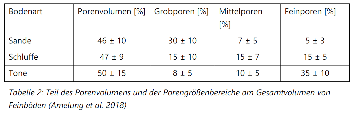 Jedoch ist die Versorgung der Pflanzen mit Wasser, sprich die nutzbare Feldkapazität, abhängig vom Vorhandensein von Mittelporen. (Schmitt et al. 2007) Aus der Tabelle 2 lässt sich schlussfolgern, dass bei Böden mit Schluff- und/oder Tonanteilen hohe nutzbare Feldkapazitäten zur Versorgung der Pflanzen erwartet werden können. Diese Böden eignen sich somit hinsichtlich sowohl ihrer kapillaren Aufstiegshöhe als auch der Wasserversorgung der Wurzeln.