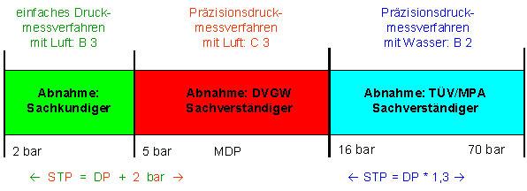 Aus Gründen des Gefahrenpotentials der hoch komprimierten Luft sollte bei Leitungen mit DP > 16 bar das Druckmessverfahren B 2 mit dem Prüfmedium Wasser zur Anwendung kommen. Hier hat sich beim Verfahrensablauf und bei den Gleichungen prinzipiell nichts geändert, so dass auf weitere Ausführungen hierzu verzichtet wird.