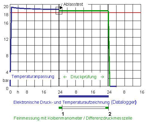 Die Leitung wird auf Prüfdruck gebracht und sollte möglichst vollständig verfüllt sein. Als Temperaturanpassungszeit gilt mindestens 1 h/bar. Dann erfolgt der Ablasstest mit anschließender Dichtheitsprüfung. Es wird empfohlen, die Präzisionsdruckmessverfahren mit elektronischem Druck- und Temperaturaufnehmer für die Dauermessung und eine jeweils 1-stündige Druckdifferenzmessung oder Direktdruckmessung mit Kolbenmanometer am Beginn und am Ende der Prüfung zu kombinieren. Dadurch erreicht man eine gegenseitige Kontrolle der beiden Messtechniken. Man behält einerseits die Messgenauigkeit durch das Kolbenmanometer bei, generiert jedoch anderer-seits die Zeiteinsparung durch die automatisierte Daueraufzeichnung von Druck und Temperaturen mit der elektronischen Messtechnik.