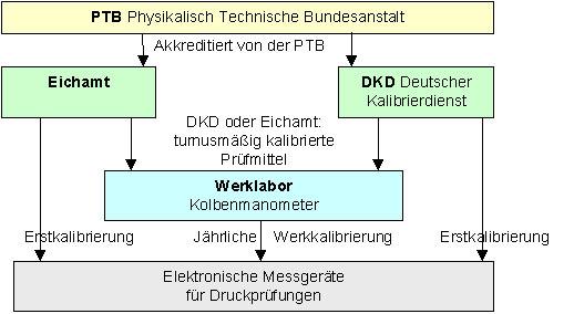 Alle Messgeräte, die für die Präzisionsdruckmessung eingesetzt werden, müssen auf das nationale Normal rückführbar zertifiziert sein. Dies gilt insbesondere für elektronische Messgeräte (Abbildung 6). Hierzu sind die elektronischen Messgeräte beim Eichamt oder gleichwertig beim Deutschen Kalibrierdienst (DKD) einer Erstzertifizierung zu unterziehen. Die Eichämter und DKD-Laboratorien werden ihrerseits durch die Physikalisch Technische Bundesanstalt akkreditiert und zertifiziert. Bei elektronischen Messgeräten kommt eine jährliche Werkszertifizierung dazu, die den Nachweis auf eine ausreichende Langzeitstabilität erbringt. Die Werkslabors können in Eigenregie ohne Akkreditierung betrieben werden, müssen jedoch z. B. für die Druckmessung ein vom Eichamt oder DKD turnusmäßig kalibriertes Prüfmittel, in der Regel ein Kolbenmanometer, vorhalten. Dem Sachverständigen wird empfohlen, sich diese Zertifikate vorzeigen zu lassen. Das Akzeptieren von nicht zertifizierten Messgeräten, insbesondere von Billiganbietern, sollte unterbunden werden.