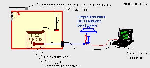 Ein Werklabor zur Zertifizierung von elektronischen Präzisionsdruckmessgeräten könnte wie folgt aufgebaut sein: Als Vergleichsnormal wird ein Kolbenmanometer eingesetzt, mit dem der jeweilige Prüfdruck hergestellt wird. Der Druckaufnehmer plus Datalogger, also die komplette Messeinheit, wird in einen Klimaschrank gestellt und, wenn möglich, 3 Temperaturmesszustände, die in der Praxis wahrscheinlich sind, eingestellt (Abbildung 7). Nach einstündiger Temperaturanpassungszeit erfolgt dann jeweils eine Doppelmessreihe von 0 auf 20 bar z. B. mit 4 bar Messschritten auf- und abwärts.