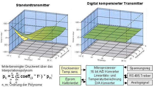 - Fehlerkompensation: Manche Drucksensorenhersteller haben sich eine besonders aufwändige Technik einfallen lassen, mit der eine bemerkenswerte Präzision erreicht werden kann. Hierbei werden in einer zweidimensionalen Matrix Referenzmessungen im Klimaschrank von Druck und Temperatur durchgeführt und die linearen Messfehler in Abhängigkeit von Druck und Temperatur über n · m Stützpunkte registriert. Aus diesen Stützpunkten wird ein Interpolationspolynom, d. h. ein so genannter Korrekturalgorithmus mathematisch abgeleitet und in ein „Eprom“ im Drucksensor eingegeben. Der Drucksensor selbst ist zusätzlich mit einem Temperaturaufnehmer und einem integrierten Mikroprozessor ausgestattet, mit dem die linearen Messfehler im Sensor integriert geglättet werden. Damit kann der Hersteller bei einem Druckmessbereich von 0 bis 10 bar bzw. bei einer Offsetschaltung von 12 bis 22 bar und einem Temperaturgang von ±0°C bis +30 °C einen Messfehler von < 0,05% garantieren. Damit erreichen diese Sensoren die volle Tauglichkeit für Präzisionsdruckmessungen. Die Langzeitstabilität gibt der Hersteller mit 0,02%/a an, so dass eine Nachkalibrierung gemäß G 469 E alle 5 Jahre erforderlich wird.