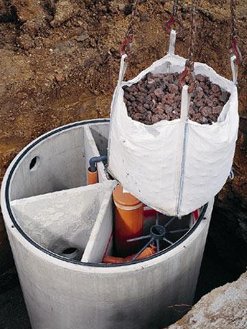 Tropfkörperanlagen sind die Repräsentanten altbewährter Basistechnologie in der dezentralen Abwasserreinigung. Moderne Ausführungen erfüllen bei geringstmöglichen Betriebskosten alle administrativen Mindestanforderungen mit höchster Zuverlässigkeit. Tropfkörpersysteme enthalten eine Schüttung aus großporigem Schlackematerial, oftmals Lavagestein, das den reinigungsaktiven Mikroorganismen als Aufwuchssubstrat dient. Bei gleichmäßiger Abwasserberieselung bilden sie auf dem Material einen Bakterienrasen, der die Abwasserinhaltsstoffe wirksam abbaut. Den hierzu erforderlichen Sauerstoff erhalten die Bakterien durch Luft, die mittels natürlicher Thermik von unten durch die Schüttung strömt. Ein Nachklärabteil beruhigt das gereinigte Wasser und lässt überschüssige Biomasse sedimentieren. Um den Abwasserstrom von bis zu acht Personen zu bewältigen, genügt eine Mini-Ausführung, bei der alle Anlagenkomponenten in einem einzigen Behälter Platz finden. Als nächste Größenvariante schließen zwei-Behälter-Anlagen an und ab etwa 20 Einwohnern verteilen sich die verschiedenen Anlagenfunktionen in der Regel auf drei Behälter. Es gilt heute als Standard, dass die Behälter in jedem Fall anschlussfertig geliefert und vom LKW direkt in die Baugrube gekrant werden.