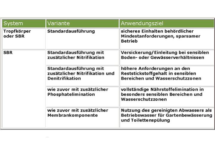 Auch eine SBR-Anlage gelangt auf diese Weise zum Kunden. Ausführungen bis etwa 50 Einwohner kommen mit einem Behälter aus. Außerdem gibt es SBR-Nachrüstsätze für bereits bestehende Faulanlagen. Die SBR-Technik arbeitet nach dem Aufstauprinzip. Das Abwasser wird also nicht im kontinuierlichen Durchlauf sondern chargenweise gereinigt. Das hierfür vorgesehen Kompartiment wird aus der Vorklärung mit einer definierten Abwasserportion befüllt, die dann ein festgelegtes, den jeweiligen Gegebenheiten genau angepasstes Reinigungsprogramm absolviert. So lässt sich ein besonders hoher Reinigungseffekt erzielen. Die Mikroorganismen schwimmen frei im Behandlungsbecken. Der Sauerstoffeintrag erfolgt durch Druckluft. Nach Abschluss der biologischen Reinigung erfolgt die Nachklärung im gleichen Becken. Am Ende wird das gereinigte Wasser abgepumpt; das Becken kann für den nächsten Reinigungszyklus neu befüllt werden. SBR-Anlagen sind kompakt. Sie erzielen hohe Leistung auf sehr kleinem Raum. Schwankungen der Zulaufmenge und Abwasserzusammensetzung wirken sich kaum auf die biologische Abbauleistung aus. Und SBR-Anlagen lassen sich durch Zubehörmodule stufenweise unterschiedlichen Anforderungen anpassen: als nitrifizierendes System, als Betriebseinheit mit Nitrifikation und Denitrifikation sowie zusätzlich auch mit Phosphatelimination und schließlich durch Einbau einer Membrankomponente sogar für die Nutzung des Ablaufs als Betriebswasser (vgl. Tabelle). Diese hohe Flexibilität ermöglicht betriebssichere Systemlösungen für jeden Bedarf – mit der CE-Plakette normgerecht in ganz Europa und am jeweiligen Einsatzort punktgenau anwenderorientiert.