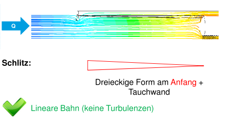 Anschließend wurden die Rechenergebnisse in einem großen Labormodell unter verschiedenen definierten Bedingungen erfolgreich simuliert und die optimierte Schlitzform für den Abschlag verifiziert.