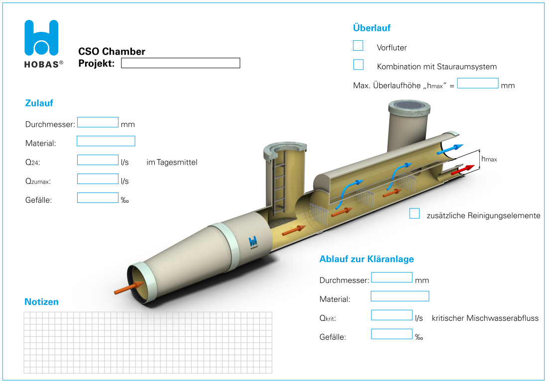 Der HOBAS CSO Chamber ist für alle Mischwassersysteme im Neubau und in der Nachrüstung geeignet. Die Auslegung erfolgt mittels einer Abfrage von Randbedingungen am jeweiligen Einsatzort durch einen von HOBAS entwickelten Fragebogen. Die Randbedingungen müssen vorab vom Planer und den zuständigen Behörden festgelegt werden.
