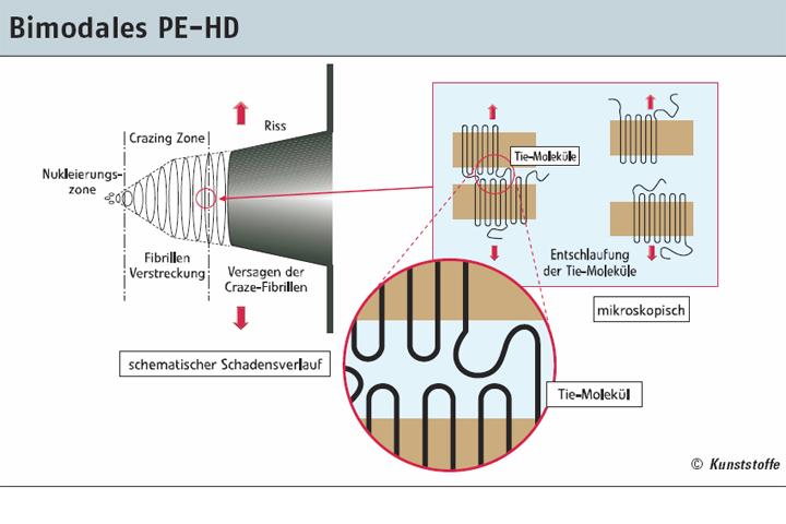 Dieses bimodale PE-HD weist eine Molmassenverteilung mit zwei Gipfeln auf und erreicht bei gleichem Comonomer- Gehalt eine höhere Dichte als unimodales PE-HD. In diesen als intrinsische Polymerlegierungen oder Reaktorblends [5] bezeichneten Werkstoffen sind die kurzen Ketten überwiegend kristallin geordnet – daraus resultieren hohe Steifigkeit und geringe Kriechneigung –, während die langen Ketten mit den Kurzkettenverzweigungen eine amorphe Struktur ausbilden und zugleich als Verschlaufungsmoleküle ("Tie Molecules") die kristallinen Bereiche verbinden (Bild 1) [4]. Diese Doppelfunktion der hochmolekularen Ketten ergibt hohe Werte für Zähigkeit, Spannungsrissbeständigkeit und Kerbunempfindlichkeit.