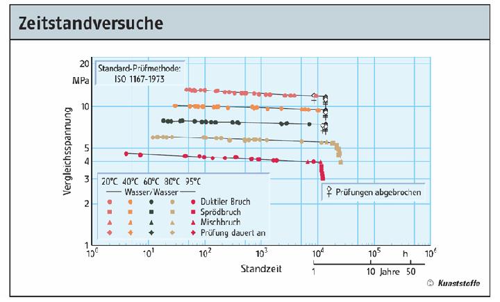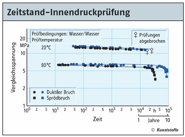 Auf einem ähnlichen Prüfstand befinden sich Prüfmuster aus den ersten PE-HD-Rohrwerkstoffen seit 1956 ununterbrochen im Zeitstand-Innendruckversuch. Diese Proben werden in Kürze im Langzeitversuch ohne Zeitraffung belegen, dass bereits die aus den ersten Chargen produzierten Rohre die hohen Erwartungen an deren Nutzungsdauer erfüllen.