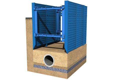 - Entwicklung eines Linearverbausystems mit vertikal verlaufenden Kanälen in den Verbauplatten, durch die ein fließfähiges Verfüllmaterial in den Zwischenraum zwischen Rohraußenwand und Verbau eingeleitet werden kann (Emunds+Staudinger GmbH, Hückelhoven).