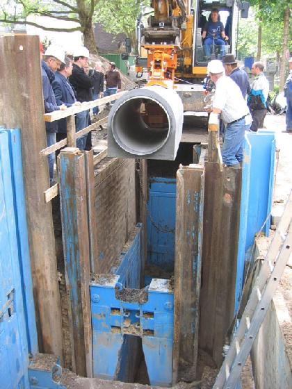 Trotz der geringen Grabenbreite war eine lage- und höhenmäßige exakte Verlegung der Rohre möglich. Der schmale Bereich zwischen der Rohraußenkante und dem gewachsenem Boden wurde gleichzeitig mit dem Ziehen der unteren Verbautafeln mit einem ebenfalls auf der Baustelle angemischten fließfähigen und innerhalb weniger Stunden hydraulisch abbindenden Bodenmaterial verfüllt, so dass eine homogene Einbettung der Rohre dauerhaft sichergestellt ist.