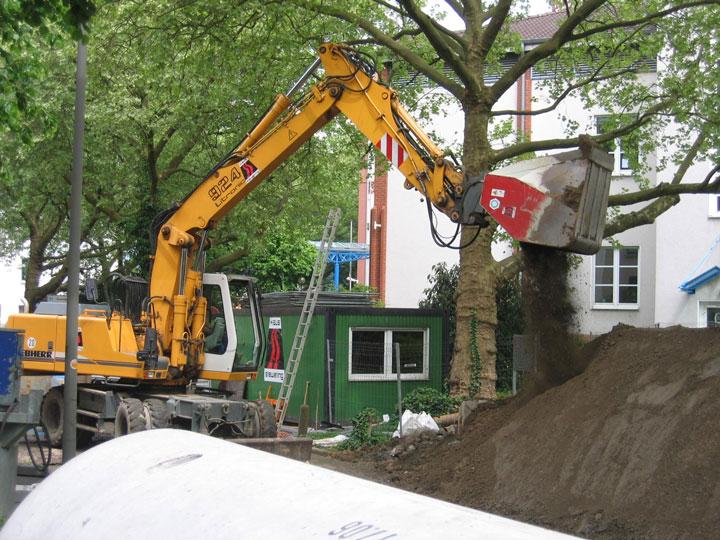 Durch den Einsatz einer speziellen Schnellwechselvorrichtung konnten alle Anbaugeräte am Hydraulikbagger – Tieflöffel, Greifer, Rohrverlegegerät, Separator zur Bodenaufbereitung, Verdichtungsgerät etc. – problemlos gewechselt werden, so dass die Baustelle mit nur einem gummibereiften Bagger realisiert werden konnte. Besonders hervorzuheben ist, dass eine Aufbereitung des ansonsten zum Wiedereinbau nicht geeigneten bindigen Grabenaushubs direkt auf der Baustelle umgesetzt wurde, so dass lediglich geringe Restmengen des Bodens zur Deponie abgefahren werden mussten.