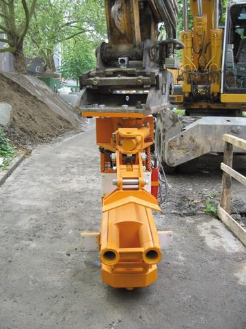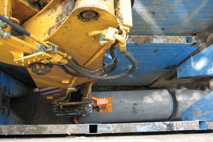 Als zweites Kernelement wurde - als Anbaugerät für den Bagger – ein Verlegegerät entwickelt. Hiermit kann der Baggerfahrer das Rohr aufnehmen, in den verfahrensbedingt sehr schmal verbauten Rohgraben einfädeln und mit dem vorher verlegten Rohr zusammenschieben.
