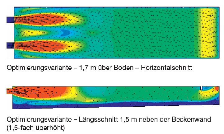 Zur Optimierung der Bauform der Becken bieten sich mittlerweile neben der Durchführung von halbtechnischen Modellversuchen als kostengünstige und flexible Möglichkeit dreidimensionale Simulationsrechnungen der Strömungs- und Sedimentationsprozesse an. Dazu wurde hier das Programmsystem Fluent [11] herangezogen. Dabei wurden neben den notwendigen Gleichungen zur Ermittlung des Strömungsfelds vier Transportgleichungen gelöst, die jeweils eine Kornfraktion repräsentieren und in denen auch die jeweils zugehörige Sinkgeschwindigkeit berücksichtigt wurde. Nach einer ausgiebigen Modellprüfung für den speziellen Anwendungsfall wurde in unterschiedlichen Rechenläufen iterativ die Bauform der Abscheider hinsichtlich der Strömungsverhältnisse optimiert.