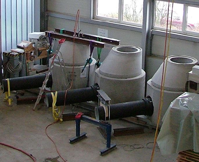 Nach dem oberirdischen Zusammenbau von Rohr und Schacht winkelten die IKT-Forscher das Rohr schrittweise um 13 mm/m bis 34 mm/m bzw. 0,7° bis 1,9° ab. Durch Gewichte, die über Styroporkissen die Rohroberseite belasteten, wurde die jeweilige Abwinklungsstufe eingestellt und mit Hilfe entsprechender Wegaufnehmer kontrolliert.