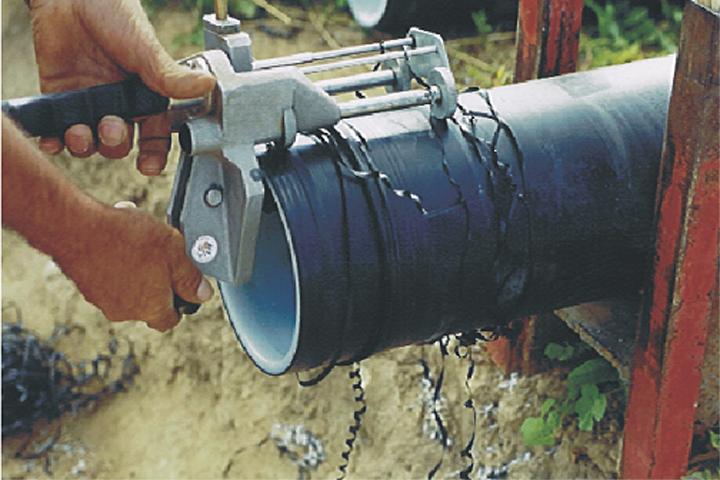 Zum Abarbeiten der Oxidhaut (Bild 6), die sich während der Lagerung durch Sonneneinstrahlung auf der Rohroberfläche bildet, werden mechanische Schälgeräte empfohlen, die eine reproduzierbare Qualität in der Fügeebene gewährleisten. Diese Oxidhaut muss vor jeder Schweißung sorgfältig vom Rohr entfernt werden, da sie sonst eine homogene Verbindung der Materialien verhindert.