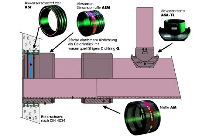 Für die Anbindung der Freispiegelleitung an den Betonschacht (Bild 8a, 8b) wurde speziell eine Kombination aus Abwasserschachtfutter ASF und Abwassereinschubmuffe AEM entwickelt. Aktuell wird das Programm um den Schachtanschluss ASF/AEM DN500/d560 ergänzt. Um den Anforderungen beim Anschluss an den Betonschacht gerecht zu werden, wird an diesem Punkt bewusst auf die konsequente Schweißung des Systems verzichtet. Zugspannungen sollen nicht auf das Betonbauwerk wirken. Die spezifischen Belastungen gerade im Bereich des Schachtes, wie Setzungen aber auch Längen-/Durchmesseränderungen des PE-Rohres durch Temperaturunterschiede erfordern zum einen die gelenkige Ausführung des Anschlusses, zum anderen an dieser Stelle gerade keine Längskraftschlüssigkeit. Die Steckverbindung lässt genügend Spielraum um die wirkenden Belastungen durch Bewegungstoleranz fernzuhalten. Die dreifache Dichtsystematik bietet ausreichend Sicherheit um diesen spezifischen Anforderungen gerecht zu werden.Schachtfutter
