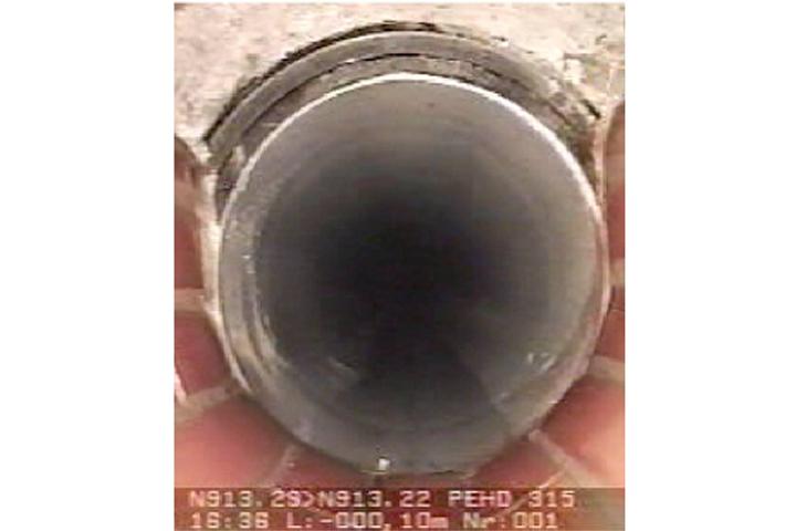 - Der Verbindungsbereich ist sohlengleich, weist eine hydraulisch optimale glatte Oberfläche auf, ohne Muffenspalt, ohne Wulst und ohne Versatz. Ablagerungen, Blockaden und Funktionsstörungen durch behinderten Abfluss werden dadurch im Kanal von vornherein vermieden (Bild 2, 3).