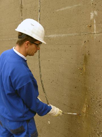 Die rund 700 Meter Fugen in den beiden Bauwerken wurden durchwegs nach dem gleichen Muster saniert. Im ersten Arbeitsgang wurden Fugenreste entfernt und die entleerten Fugen durch Hochdruck-Wasserstrahl gereinigt. Ausgebrochene Fugenkanten wurden aufprofiliert, bevor man die Fugenwandungen mit einem Primer behandelte. Durch Einlegen eines Poly-Fugenbandes in die Fuge stellte man sicher, dass das später verpresste Fugen-Dichtmaterial keine dreiseitige Haftung zum Beton einging - eine wesentliche Voraussetzung für die Elastizität der Fuge. Zugleich definiert das Poly-Fugenband die eigentliche, mit Dichtmaterial zu füllende Fugentiefe. Auf das liegende Fugenband verpresste man aus einer Kartusche heraus einen dauerelastischen Dichtstoff auf Polyurethan-Basis.