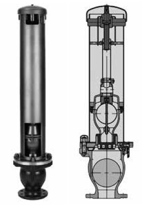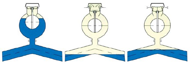 | Mitte: | Bei negativem Druck fällt der Schwimmkörper ab. Die Düsenventile öffnen und Luft tritt in die Leitung ein. Der Flüssigkeitsspiegel sinkt entsprechend ab. |