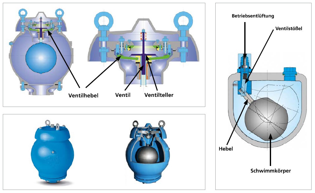 Zur Absicherung der Rohrleitung gegen unzulässige Druckschwankungen für einen störungsfreien Betrieb ist je nach Betriebszustand eine Belüftung oder Entlüftung der Leitungsanlage erforderlich. Die in Leitungen eingeschlossenen Gasblasen (Luft, Kohlensäure usw.) verringern den freien Strömungsquerschnitt, erhöhen den Druckverlust in der Leitung und erzeugen unter Umständen unerwünschte Druckstöße.
