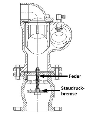 Staudruckbremsen werden eingesetzt, um Be- und Entlüftungsventile vor Druckstößen zu schützen. Im Gehäuse der Armatur ist ein Absperrkörper in der Strömung beweglich gelagert. Bei Überschreiten einer bestimmten Strömungsgeschwindigkeit wird der Absperrkörper vom Medium in den Gehäusesitz geführt. Es bleibt nur ein reduzierter Querschnitt frei. Damit in Revisionsfällen das Beund Entlüftungsventil von der Rohrleitung abgetrennt werden kann, wird häufig vor dem Be- und Entlüftungsventil ein Absperrschieber angeordnet. So kann das Be- und Entlüftungsventil auch während des Betriebes der Hauptleitung demontiert oder gereinigt werden. Ein weich dichtender Schieber ist für diese Funktion am besten geeignet, da er einen freien Durchgang zulässt. Um das Belüften bei kleinen Be- und Entlüftungsventilen zu verhindern und nur das Entlüften sicherzustellen, werden häufig Be- und Entlüftungsventile mit Belüftungssperre eingesetzt. Diese Ventile finden ihre Anwendung hauptsächlich bei Saugleitungen für mechanisch gereinigtes Wasser oder im Trinkwasserbereich.