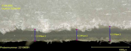 Für die Untersuchungen wurden die beiden Linerstücke zunächst ausführlich fotodokumentiert, gereinigt und visuell begutachtet. Dabei zeigte sich bereits, dass beide Liner keinen signifikanten Abrieb aufwiesen. „Beim Säubern der Innenfläche ist uns aufgefallen, dass die fertigungsbedingt im PE-Coating existierenden oberflächlichen Poren immer noch erkennbar sind und nicht während des Betriebes verschlissen wurden. Damit ist im Prinzip noch der Original-Einbauzustand vorhanden“, so Goldenstein. Eine genauere mikroskopische Betrachtung zeigte auch keine Verfärbungen, Eintrübungen oder Rissbildung, die auf eine chemische Veränderung des homogen aufgebauten Coatings hinweisen würden. Dessen gemessene Dicken betrugen bei beiden Linern zwischen 0,2 und 0,4 Millimetern, wobei das Coating in allen untersuchten Bereichen vollständig am Schlauchliner anlag. Ebenfalls mikroskopisch betrachtet wurden Wandaufbau sowie Wanddicken der Linerproben. Auch hier zeigten sich in den untersuchten Bereichen jeweils ein gleichmäßiger, homogener Wandaufbau mit einer durchschnittlichen Wanddicke von 8,76 Millimeter (Kreisprofil) bzw. 9,1 Millimeter (Eiprofil).