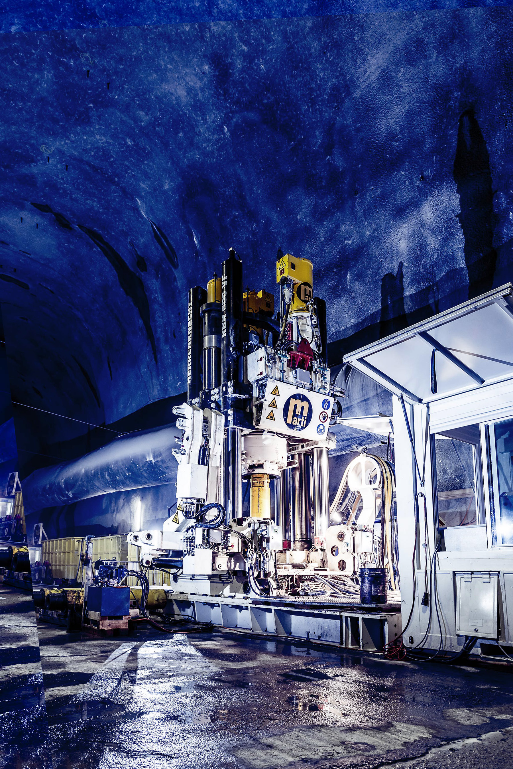 Um die Arbeitssicherheit für das Bedienpersonal zu verbessern, orderte Marti für das zweite Nant-de-Drance-Rig bei Herrenknecht eine automatische Gestängefixierung. Sie ersetzt dieübliche manuelle Fixierung beim Ver- bzw. Entschrauben des Bohrgestänges, die das Personal sonst direkt auf dem Rig vornehmen muss. Darüber hinaus beschleunigt die automatische Fixierung den Ein- und Ausbau der Bohrgestänge. Diese Optimierung im Arbeitsablauf wirkt sich besonders positiv aus, wenn zu Servicezwecken ein kompletter Bohrstrang ausgebaut und wieder eingebaut werden muss.