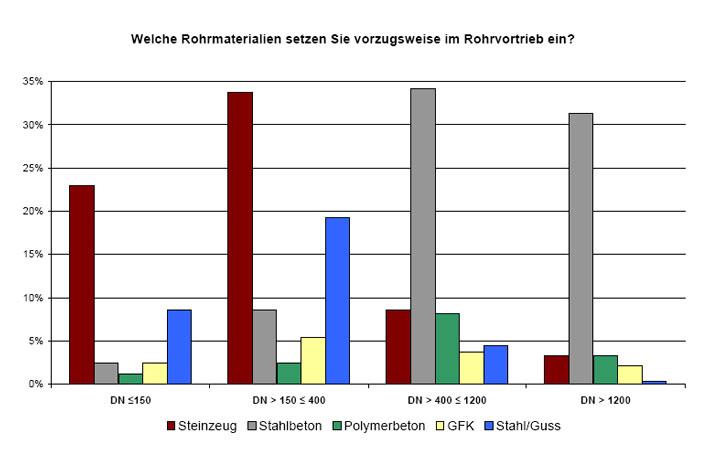 Ein weiteres Augenmerk der IKT-Marktumfrage 2007 gilt den favorisierten Rohrmaterialien für den Vortrieb. Gefragt wurden die Netzbetreiber, welche Rohrmaterialien sie beim Rohrvortrieb bis DN 1200 für geeignet halten und welche Materialien sie tatsächlich im Rohrvortrieb einsetzen.