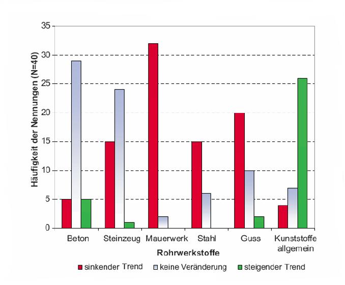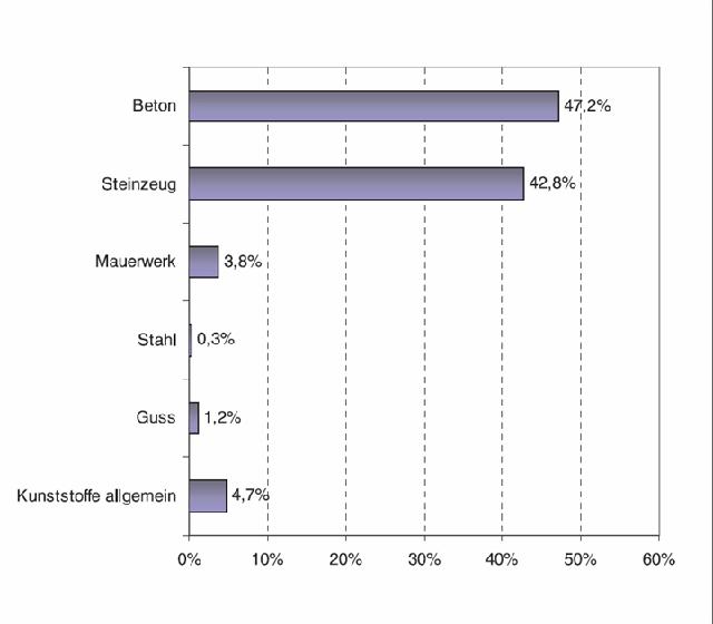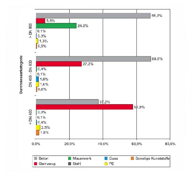 Die Auswertung der Umfrage ergab, dass Beton als dominanter Werkstoff für Rohre mit einer Nennweite > DN 400 angesehen werden kann, während für kleinere Nennweiten bevorzugt Steinzeug eingesetzt wird. In der Kategorie > DN 800 existiert nach wie vor ein beträchtlicher Anteil von Kanälen aus Mauerwerk. Die Gruppe der Kunststoffe hat nur einen geringen Anteil am Gesamtnetz, der mit steigendem Durchmesser weiter abnimmt. In allen Nennweiten ist PE der am häufigsten eingesetzte Kunststoff. Offensichtlich wurde bisher gerade bei größeren Nennweiten eher den "traditionellen" Werkstoffen Beton und Steinzeug vertraut.