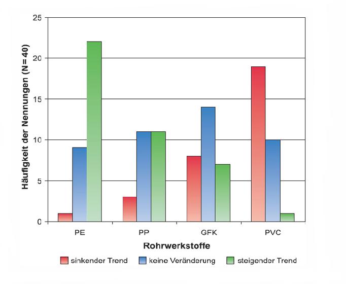• Deutlich sind auch die Einschätzungen der Befragten zu Kunststoffen als Werkstoff im Abwasserbereich. In den kommenden fünf Jahren rechnet eine große Mehrheit der Netzbetreiber damit, dass ihr Anteil am Kanalnetz steigen wird. Bei näherer Betrachtung der Kunststoffe zeigte sich, dass dieser positive Trend der Kunststoffe im Wesentlichen von PE getragen wird. Eher indifferent waren die Befragten bei der Beurteilung der Perspektiven von PP und GFK, lediglich bei PVC war sich die Mehrheit sicher, dass der entsprechende Anteil in den kommenden Jahren sinken wird ( Bild 4 ).