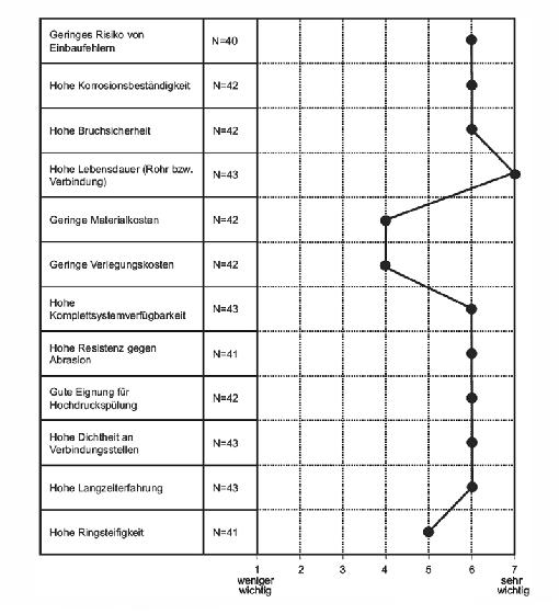 Nach welchen Kriterien entscheiden sich deutsche Kanalnetzbetreiber aber für oder gegen einen Rohrwerkstoff? Im Rahmen dieser Untersuchung wurden die Befragten gebeten, verschiedene Werkstoffeigenschaften nach ihrer Wichtigkeit auf einer siebenstelligen Skala zu gewichten. Das Ergebnis ist in Bild 5 dargestellt.