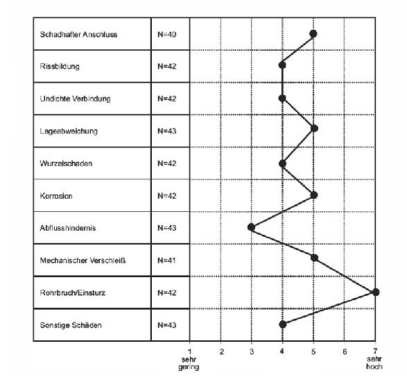 Neben der Schadensanzahl ist zu berücksichtigen, dass verschiedene Schadensursachen unterschiedlich hohe Kosten zur Folge haben. Hierzu wurden die befragten Kanalnetzbetreiber gebeten, qualitativ die Kosten zu beurteilen, die bei der Reparatur typischer Schadensarten anfallen. In Bild 7 sind diese qualitativen Einschätzungen der Reparaturkosten verschiedener Schadensarten dargestellt. Als vergleichsweise hoch werden dabei die Kosten zur Behebung von Rohrbrüchen und Einstürzen, schadhaften Anschlüssen, Lageabweichungen, Korrosion und mechanischem Verschleiß angesehen. Nach [11] kann die Häufigkeit zahlreicher eher "teuerer" Schäden durch den Einsatz biegeweicher Rohrwerkstoffe wie PE signifikant gesenkt werden. Die in jener Studie beobachteten Schadensraten pro Kilometer sind in Bild 8 dargestellt.