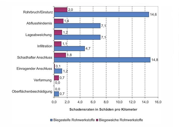 Diese Schadensraten sind nicht als eine jährliche Rate zu verstehen, sondern bezeichnen eine Momentaufnahme zum Zeitpunkt jener Studie. Deutlich ist zu erkennen, dass die biegeweichen Rohrwerkstoffe bei fast allen Schadensbildern wesentlich geringere Schadensraten aufweisen als die biegesteifen Werkstoffe. Eine Ausnahme bildet nur die Schadensart Verformung. Biegeweiche Rohre weisen nach dieser Studie 0,7 Verformungsschäden pro Kanalkilometer auf, während bei den biegesteifen Werkstoffen keine Verformungen beobachtet werden konnten. Inwieweit eine Verformung des Rohres im Falle von biegeweichen Rohren tatsächlich als Schaden angesehen werden kann, ist fraglich. So werden z. B. bei statischen Berechnungen der biegeweichen Rohrsysteme nach DWA-ATV A 127 von vornherein Verformungen angenommen. Diese zulässigen Verformungen beeinträchtigen in keiner Weise die Funktionsweise der Rohrsysteme. Extreme Verformungen sind nicht durch den Werkstoff, sondern durch eine mangelhafte Auslegung oder Verlegung begründet und können durch ingenieurmäßige Planung und sachgemäße Verlegung ausgeschlossen werden.