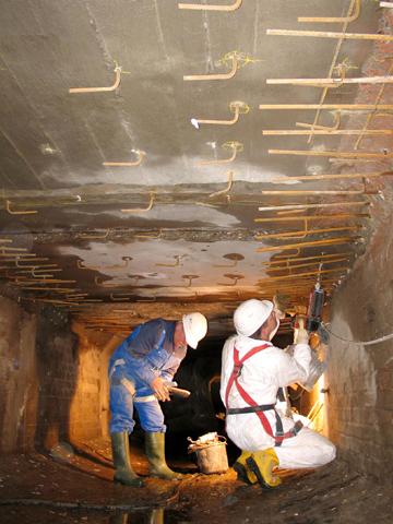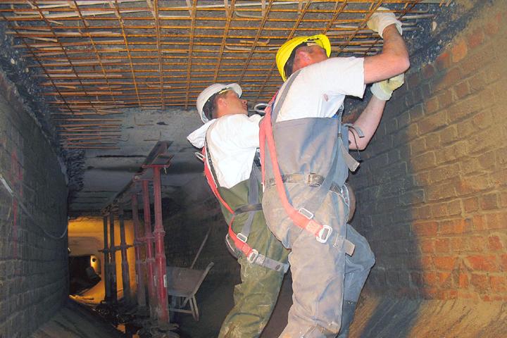 Anschließend befestigte man im gesamten gesamten Sanierungsbereich Anker und Längseisen an der Decke und im Bereich des Deckenauflagers. Diese wurden sowohl herkömmlich gebohrt als auch mit einem Spezialmaterial der Fa. Hilti geklebt. Die Verklebung sorgte für einen 100prozentigen Kraftschluss der Anker mit der Rohrwand über den gesamten Ringraum des Bohrprofils. An diesen Ankern und Längseisen wurden die neuen Bewehrungsmatten aufgehängt und schwingungsfrei verknüpft. Daraufhin erfolgte der Auftrag einer 13 Zentimeter starken Spritzbetonschicht nach DIN 18551 im Trockenspritzverfahren.