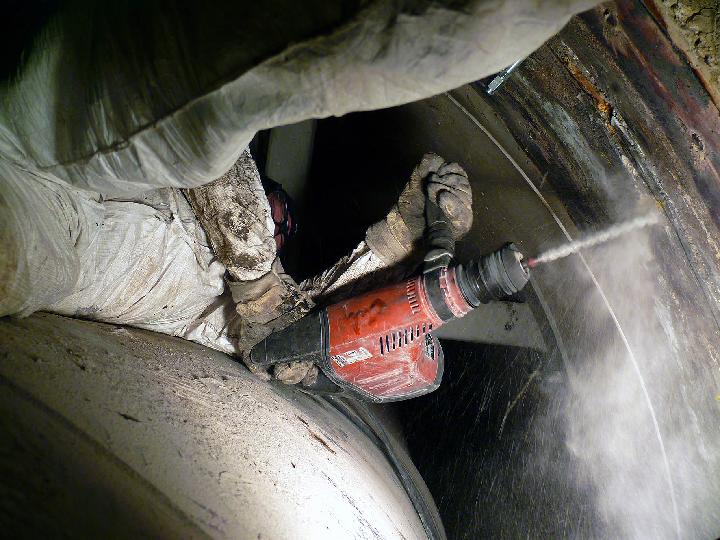 In einem ersten Arbeitsschritt wurden deshalb Entlastungsbohrungen gesetzt, um den anstehenden Wasserdruck abzubauen. Anschließend durchbohrte man im Abstand von jeweils rund 15 Zentimetern die 45 Zentimeter starke Stahlbeton-Schachtwand unmittelbar außerhalb des Tunnelrohrs. In diese Bohrungen setzten die SMG-Experten-Packer, durch welche von der Sohle her aufsteigend das Material injiziert wurde. Schon nach wenigen Injektionen hatte man den Grundwassereintritt auf diese Weise bereits offenkundig gestoppt. Im dritten Arbeitsgang demontierte man das aufgeblähte Fugenklemmband und konnte anschließend den Bereich der primären Dichtung tangential anbohren und ebenfalls verpressen. Zuvor war der Muffenspalt rundum mit einer Mörtelplombe verschlossen worden. In dieser Phase verfügte das Bauwerk also wieder über eine neue, funktionsfähige Primärdichtung. Als sekundäre Dichtung installierte man im Anschluss an eine sorgfältige Reinigung der Oberflächen jeweils eine AMEX-10-Manschette DN 2500.