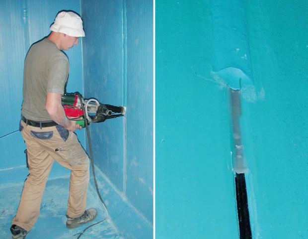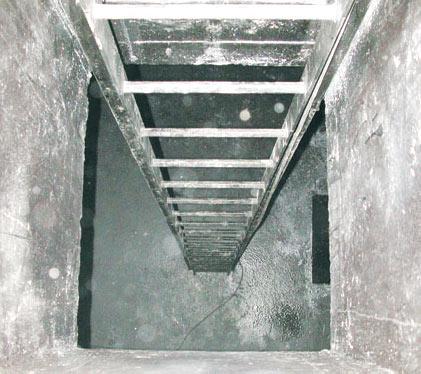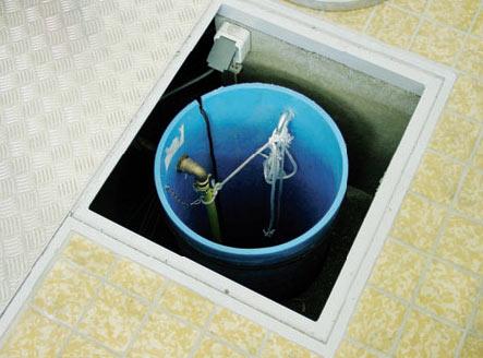 Im Zuge der Auskleidung wurde der Behältereinstieg saniert und in einem ehemaligen Pumpensumpf ein Drainageschacht eingebaut (Abbildung 8). In diesen wurde eine einfache Tauchpumpe gesetzt, um anstehendes Drainagewasser, das gegebenenfalls zwischen der Auskleidung und der Behälterwandung anfällt, über das Maschinenhaus in einer getrennten Leitung abzuführen. Zur Quantifizierung der anfallenden Drainagemenge wurde die Tauchpumpe mit einer Laufzeiterfassung ausgerüstet. Seit Inbetriebnahme des Reinwasserbehälters im August 2003 betrug die Laufzeit der Tauchpumpe innerhalb von 1,5 Jahren rund vier Stunden, was bei einem Fördervolumenstrom von 4 m3 pro Stunde einem mittleren Drainwasseranfall von rund 30 L/d entspricht.
