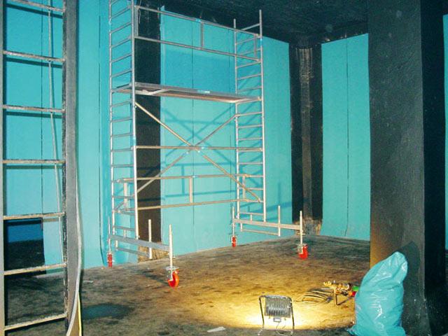 Auf Grund von turnusmäßigen Reinigungsarbeiten und wiederholten positiven mikrobiologischen Befunden wurde der Behälter im Jahre 2001 außer Betrieb genommen. Im Rahmen einer Begehung wurde festgestellt, dass die ursprüngliche Beschichtung aus Inertol stark beschädigt war. Inertol ist ein 1-Komponenten-, phenolfreies, schwarzes Anstrichmittel auf Bitumenbasis und wurde vielfach zum Schutz von Stahl und Beton an wasserberührten Flächen eingesetzt. In einer ersten Sanierungsmaßnahme wurden alle losen und nichthaftenden Beschichtungen mittels Hochdruck (400 bar) entfernt und Risse verpresst. Anschließend wurde der Behälter vier Wochen lang mit Warmluft getrocknet und danach mit einem dreilagigen SIKA Inertol 49 W-Anstrich beschichtet. Zwischen den einzelnen Beschichtungen wurden Trockenzeiten von ca. sieben Tagen eingehalten. Während dieser Zeiten wurde für einen konstanten Luftaustausch im Behältergesorgt.