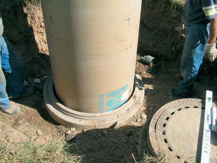 Abnehmen des Schachtkonus, Einbau eines GfK-Rohres, Verdämmung des Ringraumes Der Vorteil des Verfahrens besteht darin, dass fabrikgefertigte Rohre mit einer hohen Steifigkeit eingebaut werden können, so dass ggf. alle Lasten also Grundwasserdruck, Erdlast und Verkehrslast, letztere meist auch als Radlast unmittelbar auf die Schachtabdeckung einwirkend, abgetragen werden können. Der baubetriebliche Nachteil besteht darin, dass für den Einbau der Schachtkonus abgenommen werden muss. Der Ringraum zwischen GfK-Rohr und bestehendem Schacht wird anschließend mit einem fließfähigen Dämmer ausgefüllt, was aus statischer Sicht zu einer zusätzlichen Ertüchtigung des Gesamtbauwerks führt, da ausgewaschene Fugen wieder verfüllt werden und die Dämmerschicht zusätzlich Druckkräfte in Vertikal- und Umfangsrichtung aufnehmen kann. Im konkreten Fall sollte, in Abhängigkeit von der erforderlichen Ertüchtigung des Schachtes, eine Abwägung zwischen Dämmerdruckfestigkeit (Vergrößerung der statischen Tragfähigkeit) und Fließfähigkeit (gleichmäßige Verdämmung) gefunden werden. Ferner muss die vorhandene Kanalwandung gereinigt und ggf. vorbehandelt werden z. B. um lockere Mörtelteile zu entfernen und einen guten Verbund zwischen Dämmer und Altrohr sowie zwischen Dämmer und Relingingrohr herzustellen. Bild 1 und Bild 2 zeigen eine derartige Sanierung. Nach Einbau des Rohres wird der Anschluss zum im Kanal eingebauten Inliner (meist Nadelfilz- oder GfK-Schlauchliner aber auch verdämmte GfK-Rohre) durch Überlaminate ausgeführt. Die Berme kann entweder durch den Einbau von Handlaminaten oder von GfK-Platten, die durch Überlaminate an das Gerinne und die GfK-Schachtwandung angeschlossen werden, ausgeführt werden.