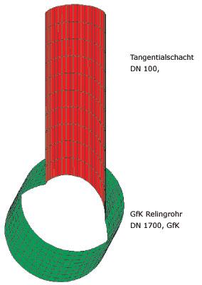 Als Alternative zu den hier dargestellten ebenen Berechnungen bietet sich die räumliche Darstellung der Problemstellung und anschließende Berechnung mit der FE-Methode an. Bild 4 zeigt das statische Modell des Anschlusses eines Tangentialschachtes DN 1000 an einen Kanal DN 1700 (beide in GfK ausgeführt). Die Diskretisierung der Rohre kann alternativ mit Hilfe von Schalenelementen oder mit Hilfe von Volumenelementen erfolgen. Die Belastungen aus Wasserdruck, Dämmerdruck, Erddruck und Verkehrslast können als Pressungen auf die Elemente sowie als Lininenlast auf die Schachtoberkante (Radlast auf dem Schachtdeckel) aufgebracht werden. Erd- und Verkehrslasten können alternativ berücksichtigt werden indem auch der Baugrund durch Volumenelemente diskretisiert wird. Der Vorteil dieser Vorgehensweise liegt in der automatischen Berücksichtigung der räumlichen Erddruckverteilung sowie in einer realistischeren Berücksichtigung des Interaktionsverhaltens zwischen Baugrund, Schacht und Rohr. Sie hat in der Regel eine geringere statisch erforderliche Rohrwanddicke zur Folge. Die Berechnung ist jedoch deutlich aufwändiger und somit auch mit höheren Kosten verbunden als die Berechnung von ebenen Querschnitten.