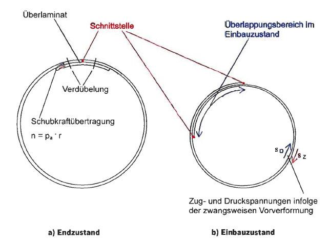 Einbau längsgeschnittener vorverformter GfK-Rohre ohne Abnahme des Schachtkonus Auch hier werden fabrikgefertigte Rohre verwendet. Sie werden in Axialrichtung aufgeschnitten und dann in Umfangsrichtung zusammengezogen um den Querschnitt soweit zu reduzieren, dass sie ohne Abnahme des Schachtkonus eingebaut werden können (Bild 5). Anschließend werden sie wieder aufgeweitet, die Schnittstelle wird dann mit Hilfe von Überlaminaten verbunden. Der Vorteil besteht darin, dass der Schachtkonus verbleiben kann. Das erforderliche Übereinanderschieben der Schnittufer in Umfangsrichtung (s. Bild 5) hat jedoch zur Folge, dass nur relativ geringe Rohrsteifigkeiten (möglichst flexible Rohre) ausgeführt werden können, da andernfalls die Materialfestigkeit des Rohres bereits bei dieser Zwangsbeanspruchung im Bauzustand überschritten werden kann. Dies bedeutet eine Beschränkung des Anwendungsbereichs auf Schächte, die noch voll standsicher hinsichtlich Erd- und Verkehrslasten sind und nur wegen Undichtigkeiten saniert werden. Erd- und Verkehrslasten können nicht abgetragen werden. Die Rohre können Close-Fit eingebaut werden, so dass keine Dämmerverfüllung erforderlich ist. Hinsichtlich der Ausbildung des Sohlbereichs sowie der Anschlüsse an die Abwasserleitung ergeben sich die gleichen Alternativen wie bei der ersten Variante (Einbau von verdämmten GfK-Rohren ohne Längsschnitt). D. h Überlaminatverbindungen zu den Schlauchlinernern oder verdämmten Linern im Kanalbereich, Beschichtung der Berme durch Handlaminate und Verwendung von GfK-Platten zur Beschichtung der Berme. Sofern die Auskleidung bis zur Schachtoberkante erfolgen soll, kann der Konus ebenfalls mit Handlaminaten ausgekleidet werden. Die Schnittkanten sind durch ein Überlaminat (s. Bild 5) zu verbinden. Dieses Überlaminat kann entweder tragend oder nur zur Abdichtung ausgeführt werden. Sofern es als allein statisch tragend für die Verbindung vorgesehen ist, muss die Ringnormalkraft aus Wasseraußendruck aufgenommen werden (s. Bild 5). Wenn das Laminat nur konstruktiv zur Gewährleistung der Dichtheit angeordnet wird, sind zusätzlich beidseitig des Vertikalschnittes Dübel in einem Abststand von ca. 15 cm, der Dübelabstand muss statisch nachgewiesen werden, anzuordnen. Die Lastfälle Erd- und Verkerhrslast und Dämmerdruck entfallen, da von einer ausreichenden Standsicherheit des bestehenden Schachtes ausgegangen wird. Die Biegebeanspruchung durch den Bauzustand (Querschnittsreduktion zur Ermöglichung des Einbaus ohne Abheben des Schachtkonus) ist statisch nachzuweisen.