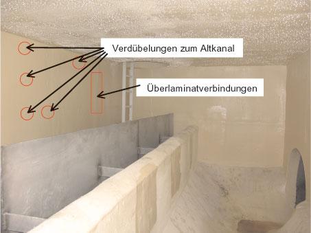 Schachtsanierung mit Hilfe von verdübelten GfK-Platten Die Sanierung bestehender Schächte mit Hilfe verdübelter GfK-Platten ist ebenfalls eine übliche Sanierungsvariante, bei Vorliegen einer ausreichenden Standsicherheit des vorhandenen Schachtes. Auch hier handelt es sich um eine Thematik, die in den Normen nicht klar geregelt ist. Die wesentlichen Problemstellungen werden im Folgenden aufgezeigt: Die Sanierung mit derartigen Verfahren kommt nur dann in Frage, wenn der bestehende Schacht noch eine ausreichende Standsicherheit aufweist, da die Auskleidung nicht dazu geeignet ist Erd- und Verkehrslasten anzutragen. Die Materialkennwerte müssen durch Eigen- und Fremdüberwachung bestätigt sein (z. B. Vorlage einer DIBT-Zulassung oder entsprechender Materialprüfungszeugnisse). Für die eingesetzten Dübel muss eine DIBT-Zulassung vorliegen. Dabei ist insbesondere darauf zu achten, dass die Dübel für das vorhandene Schachtmaterial, in der Regel handelt es sich dabei um Mauerwerk oder Beton, zugelassen sind und die zulässigen Dübelabstände eingehalten werden. Die Platten müssen durch Überlaminate wasserdicht und u. U. auch kraftschlüssig miteinander verbunden werden. Bild 6 zeigt eine ausgeführte Sanierung.