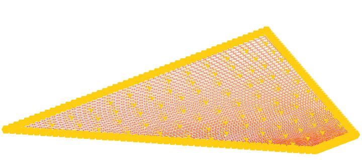 Die statische Nachweisführung hängt von der Schachtgeometrie, und den Materialkennwerten der eingesetzten GfK-Platten ab. Die GfK-Platten sind für die Einwirkung durch Wasseraußendruck statisch nachzuweisen. Bei kreisförmigen Schächten ist die Lastabtragung deutlich günstiger, da sie im Wesentlichen über die Ringnormalkraft in Umfangsrichtung erfolgt. Bei rechteckförmigen Querschnitten handelt es sich um ein reines Biegeproblem. Die erforderliche Wanddicke der Platten kann durch analytische Berechnungen oder durch FE-Berechnungen ermittelt werden. Bei der Auskleidung von ebenen Schachtflächen ist insbesondere auf die durch den Wasserdruck resultierenden Deformationen zu achten. Hierzu gibt es keinen normativen Grenz- oder Anhaltswert. Es wird daher empfohlen, einen derartigen Grenzwert vorab im Rahmen der Planung festzulegen, da die Plattenverformungen in Abhängigkeit von Dübelraster und Außendruck eine Größenordnung erreichen können, die nicht mehr akzeptabel ist (Matratzenmuster) obwohl die Tragfähigkeitsnachweise noch eingehalten sind. In Bild 7 ist die Diskretisierung einer Sohlauskleidung dargestellt. Bild 8 z. B. zeigt die Vertikaldeformationen dieses Schachtbodens mit einer Wanddicke von 3,0 mm und Anordnung eines Dübelrasters (Dübelabstand ≤ 15 cm) unter Einwirkung einer Wasseraußendruckbelastung von 5,0 m über Sohle. Es resultiert eine Verformung von immerhin 13,2 mm bei ausreichender Tragfähigkeit. Bild 9 zeigt die maximalen Hauptzugspannungen. Es ergibt sich ein Maximalwert von 28,23 N/mm². Gegenüber einer Langzeitfestigkeit von 60 N/mm² ist somit die erforderliche Scherheit von 2,0 eingehalten. Bei der Planung sollte auch berücksichtigt werden, ob die Wasseraußendrücke kurz- oder langzeitig anstehen, da die jeweils zugehörigen E-Module maßgeblich die Deformationen beinflussen. Im vorliegenden Fall wurde auf der Grundlage der durchgeführten statischen Berechnung eine minimale zulässige Dübelzugkraft von 2,0 kN vorgegeben. Die in der Zulassung angegebenen zulässigen Dübelkräfte sind statisch nachzuweisen. Dabei ist neben der Aufnahme der Ankerzugkräfte insbesondere auch auf die Gewährleistung der Auftriebssicherheit zu achten. Die Übertragung der Scherkräfte in die bestehende Schachtwandung muss abgesichert sein.