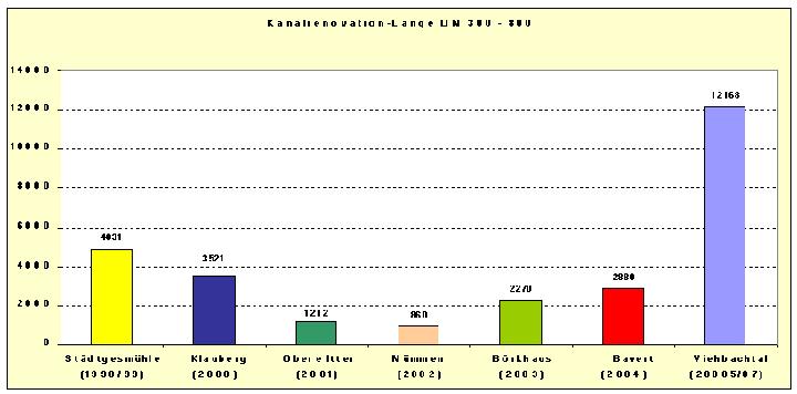 Seit dem Beginn der Sanierungsstrategie im Hauptkanal wurden bislang in 7 Entwässerungsgebieten die Kanalisationsnetze im Bereich der Schadensklassen SK 0 - 1 renoviert. Bislang wurden ca. 5,7 Mio. € investiert, um ca. 27 km Hauptkanal zu sanieren. Dies ergibt einen spezifischen Gesamtpreis von ca. 211 €/m Renovation.