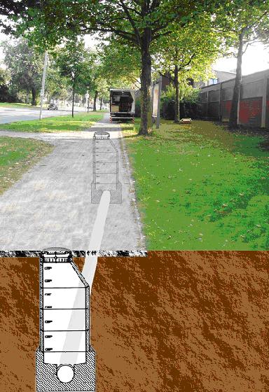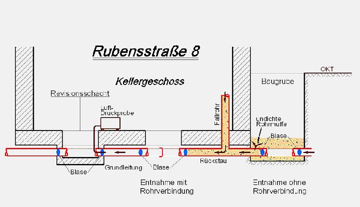 Zur Überprüfung der Rohrdichtheit wurde das vorhandene Grundleitungssystem unter der Kellersohle und zwischen den Gebäuden freigelegt. Ein Teilstrang der Grundleitung wurde dann durch die Anordnung von Abdichtungsblasen trocken gelegt und auf ihre Dichtheit überprüft. Die Anordnung der Probestrecke wurde so gewählt, dass der Abwasserrückstau in der Verbindungsleitung zwischen den Gebäuden stattfinden würde. Zum Setzen der Abdichtungsblase wurde in einer Baugrube vor dem Gebäude und unter der Kellersohle das Abwasserrohr aufgeschnitten.