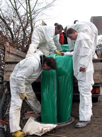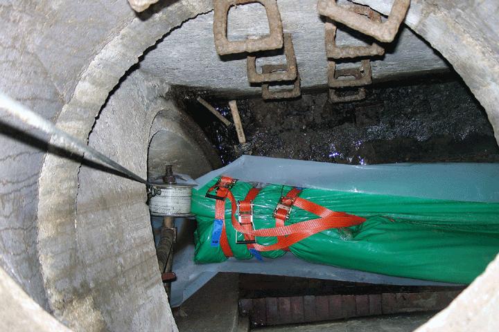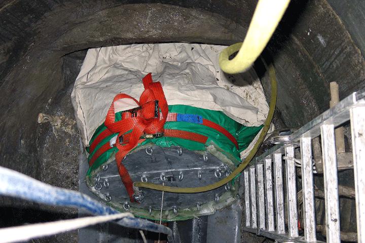 Der Einziehvorgang erforderte bei immerhin 2,8 Tonnen "Lebendgewicht" des markant grünen Liners einige Muskelarbeit der Erles-Mitarbeiter, die den Schlauch längs falten mußten, damit er sich durch den Schachtkonus hindurch einziehen ließ. Binnen einer Stunde lag er jedoch in ganzer Länge im Mischwassersammler und wurde beiderseits mit Hilfe von Drucktöpfen abgesperrt. Die Absperrkörper für diese Nennweite werden mit wenigen Handgriffen aus Einzelteilen im Untergrund montiert und gehören zur Standardausstattung des ErwoTec-Sanierungsfahrzeugs.