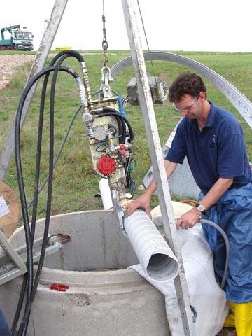 Sämtliches Sickerwasser wird über strahlenförmig in den Deponieaufbau führende Drainleitungen erfaßt und dann durch fünf Sammelkanäle zwei peripher gelegenen Schächten zugeführt. Hier wird es kontinuierlich abgesaugt und per Tankwagen regelmäßig der Nachbehandlung und Entsorgung zugeführt. Vor diesem Hintergrund entwickelte der Betreiber der Anlage die Idee, das vorhandene Sickerwasser zum Befeuchten des Müllkörpers zu verwenden, um die biologischen Abbauprozesse in Gang zu halten. Das Konzept wurde vom Landratsamt Aschaffenburg und den zuständigen Fachbehörden befürwortet, allerdings an eine wichtige Auflage gebunden: Die unterhalb der Deponiesohle verlegten Sammelleitungen sollten durch vorherige Sanierung in einen nachhaltig dichten Zustand versetzt werden.