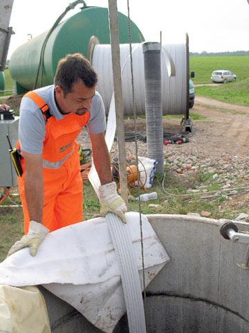 Bei Rib Loc Expanda-Verfahren, das sich im Nennweitenbereich von DN 150 bis DN 750 einsetzen läßt, wird mit Hilfe einer Wickelvorrichtung im Schacht ein Endlos-Profilstreifen aus HDPE oder PVC mit längsseitigem, doppelten Nut-Feder-Schloß so in den sanierungsbedürftigen Kanal gewickelt, dass daraus ein Rohrstrang von beliebiger Länge entsteht. Die Vorflut bleibt beim Wickelvorgang erhalten. Der Profilstreifen enthält längslaufend T-förmige Versteifungsrippen, die dem fertigen Rohr seine Statik geben. Ein feiner, in die Schloßkonstruktion eingelegter Stahldraht verhindert, dass das eingewickelte Rohr im Kanal sofort bis an die Rohrwand expandiert. Statt dessen läßt es sich erst einmal mit Untermaß - in Stockstadt mit einem Innendurchmesser von 170 Millimetern - in den Kanal einwickeln. Ist der Zielschacht erreicht, fixiert man dort das Rohrende rotationsfest, und entriegelt die Schloßkonstruktion, indem man den Draht zum Wickelkorb hin herauswickelt. Dann wickelt man vom Startschacht her einige weitere Meter Profilstreifen ein. Diese führen nun nicht zu einer Verlängerung des Rohrstrangs, sondern zu einer formschlüssigen Querschnittsaufweitung des Wickelrohrs bis an die Wand des Altrohrs - DN 200 in den Leitungen der Deponie Stockstadt. Diese Technik hat, neben der hohen Einbaugeschwindigkeit von bis zu 70 Zentimeter Neurohr pro Minute, einen Vorteil, der speziell unter extremen Einbaubedingungen zum Tragen kommt: Tritt aus irgendwelchen Gründen eine Störung des Einbauvorgangs ein, kann das noch nicht entriegelte Profilrohr problemlos wieder entfernt werden, indem man den Profilstreifen ganz einfach wieder herauszieht. Demgegenüber käme eine Schlauchliner-Havarie unter 20 Metern Tiefe fast einer Katastrophe gleich.
