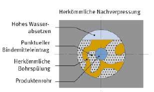 Eine kraftschlüssige Stabilisierung und eine erosionssichere Abdichtung der Bohrung kann aber weder durch eine Zumischung von handelsüblichem Zement in eine konventionelle Bohrspülung noch durch eine nachträgliche Zementinjektion erreicht werden.