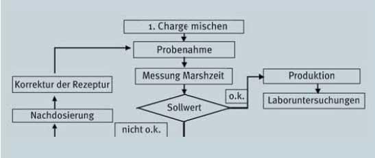 Nach Aufruf der im Mischrechner hinterlegten Rezeptur durch den Mischerfahrer wird zunächst die erste Charge gemischt, der Mischer angehalten und eine Probe entnommen. Diese Probe wird auf Einhaltung der Sollwerte für die Fließfähigkeit (Marshzeit) überprüft. Sind die Sollwerte eingehalten, wird die Produktion freigegeben.