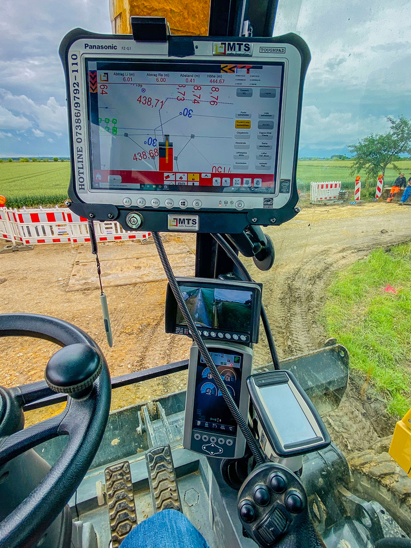 Infolge der Datenaufbereitung konnte Wörle ein As-Planned-Modell, ein 3-D-Modell des geplanten Bauwerks im Soll-Zustand, als Grundlage erstellen. Auch verschiedene Querungen durch eine Erdgas-Hochdruckleitung, eine 20 KV-Stromleitung sowie eine bestehende alte Wasserleitung, die Wörle vor Ort mithilfe von Suchschlitzen ermittelt hatte, fanden dabei Berücksichtigung. Mögliche Kollisionen konnten auf diese Weise früh erkannt und verhindert werden. Im Ausführungsplan zeichnete Wörle die genauen Eckpunkte der Betonschächte mit der Sohltiefe ein, so dass diese vor Leitungsbau an exakter Stelle gesetzt werden konnten: „Dabei haben wir das MTS-Navi als Baugrubenassistenten genutzt. Es berechnet die Baugrube mit der richtigen Größe – sowohl, was die Schachtgröße, den Arbeitsraum als auch den notwendigen Böschungswinkel anbelangt. Das Tablet zeigt dem Baggerfahrer bildlich die Baugrube an, die ausgehoben werden muss. Somit entfällt das Handaufmaß.“